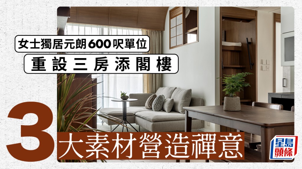 相關新聞:女士獨居元朗600呎單位 重設三房添閣樓 3大素材營造禪意