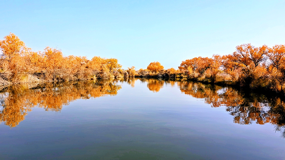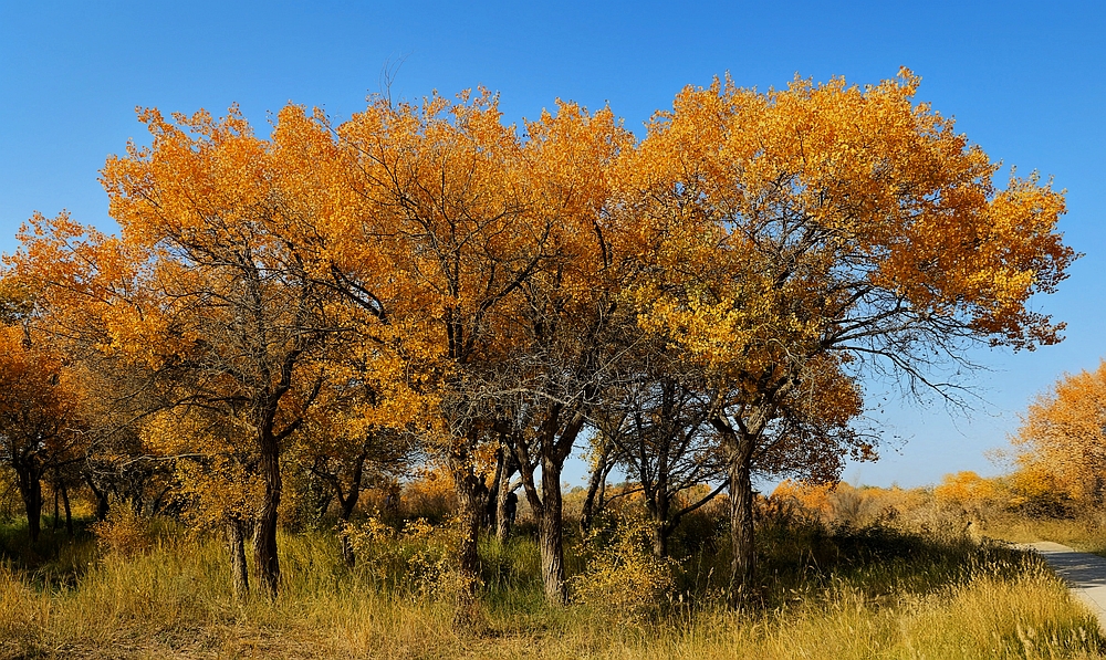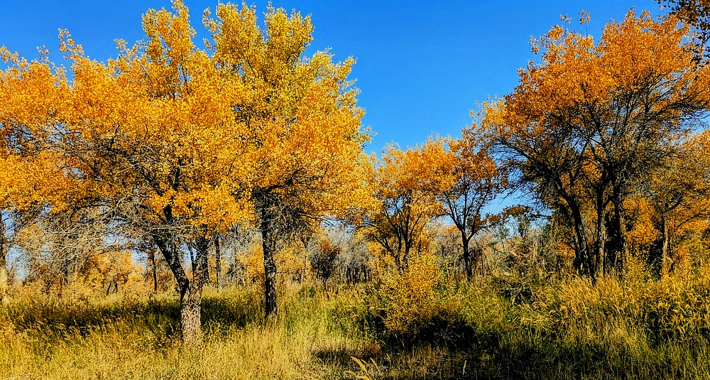 告别喀什,去泽普。这里有2万亩胡杨林。叶尔羌河流经胡杨林景区,一片绿洲,三面环水,形成碧水、金叶相映成趣的景观。此地胡杨,因为有昆仑雪水常年滋润,金色的叶子更有光泽,不像有些地区的胡杨的枯黄色。