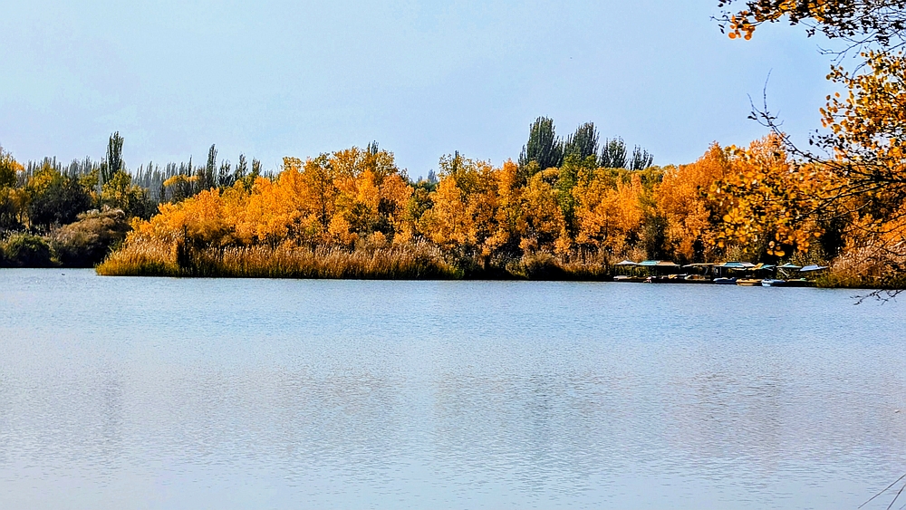 除了胡杨,泽普还生长了很多红柳,远看一团红雾。此外湖中芦苇,池上荷叶都为胡杨叶做衬托。