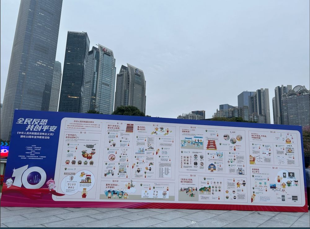 在花城广场南侧,有关于反恐法颁布10周年宣传教育活动的“全民反恐共创平安”大幅看板,还有广州公安局直升机展示,搞得声势不小。不过这是否暗示着国内恐怖活动还是一个值得关注的重大问题,还是有人小题大做,夸大其严重性不得而知。但跑到海心桥,发现两侧都有安检,桥上也有保安执勤,甚至花城广场上也有不少警察,保安,猛然意思到这恐怖活动还真不能掉以轻心。