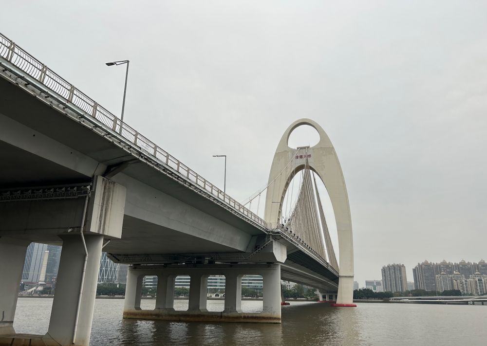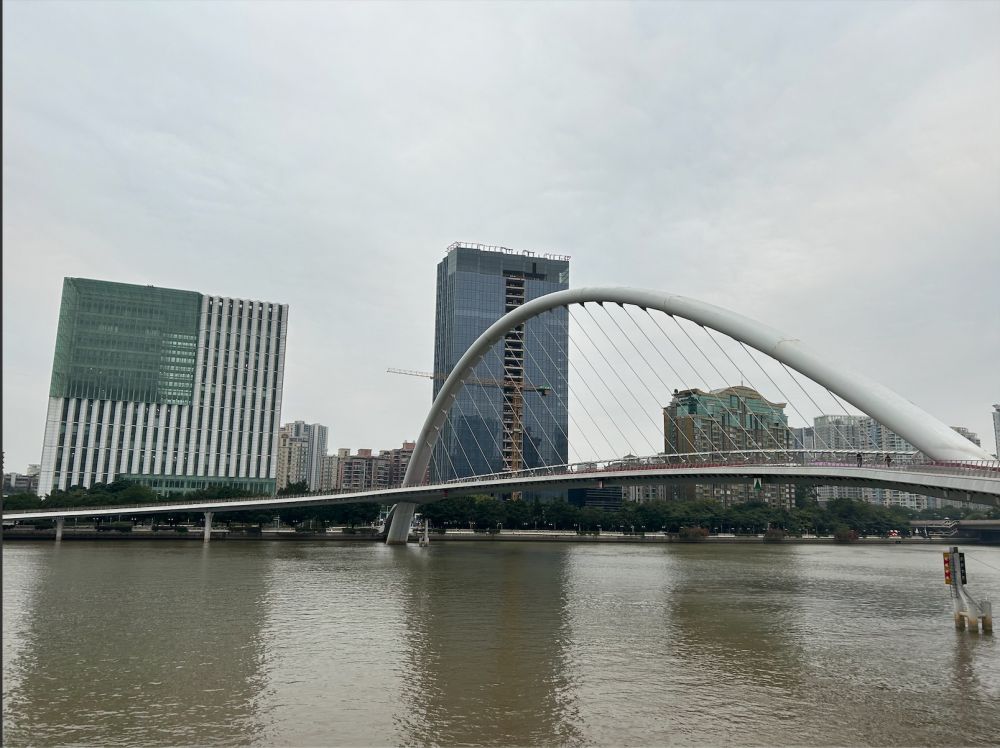 话说建于2021年的海心桥是首座珠江两岸人行桥和广州中轴线步行系统的组成部分,号称世界上跨度最大,宽度最宽的曲梁斜拱人行桥。