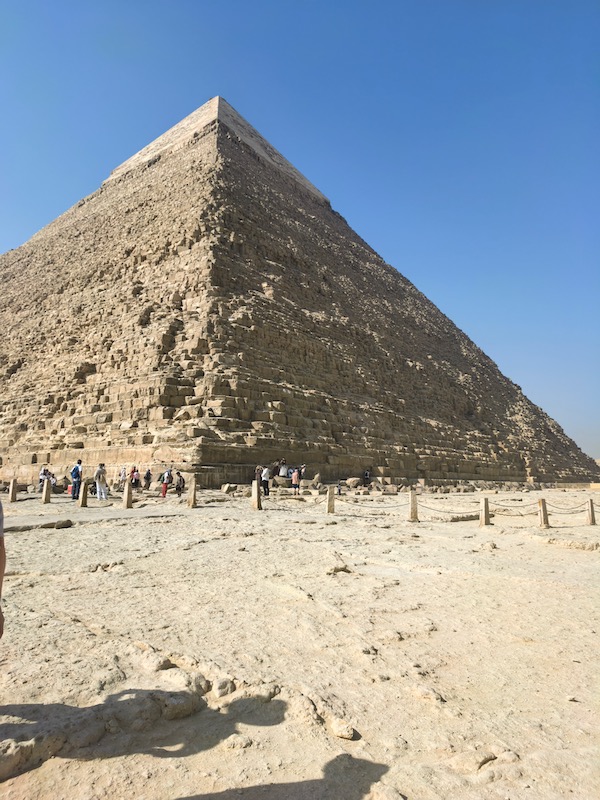 我们首先来到观景台,从远处不同角度观看几座金字塔的合影。然后来到金字塔下面,近距离观看这个伟大的古建筑奇迹。仔细端详眼前的胡夫金字塔,雄伟高大、在荒漠中拔地而起,傲然伫立。巨大的石块整齐排列,组成一个高高大大,真真正正的三角锥体。它最初高度为146.6米,经过4000多年的风霜雨雪,现存高度138.8米,导游告诉我们它的顶部曾经是包在黄金中的。金字塔由230万块大石块堆砌而成,平均每块重2.5吨,最重可达160吨。底部呈正方形,四边分别是正南、正北、正东、正西,误差不超过0.05度,完美契合地球子午线。旁边的卡夫拉金字塔较胡夫金字塔稍微矮一点,最初高度为143.5米,现存高度136.4米,但看上去好像更高一些,那是因为它的地基较高的缘故。它的顶端仍保留部分光滑的原始石灰岩外壳,在阳光下泛着淡金色的光泽。孟卡拉金字塔是最小的一座,高62米。但是它的石材加工更为精细,建筑比例更为规整,展现金字塔建造技术的延续和精进。三座金字塔沿东西向一字排开,精准指向天空中猎户座。胡夫金字塔内有四个向上的通道,直指天空,是古埃及人将法老灵魂引向星辰实现永生的宇宙通道。