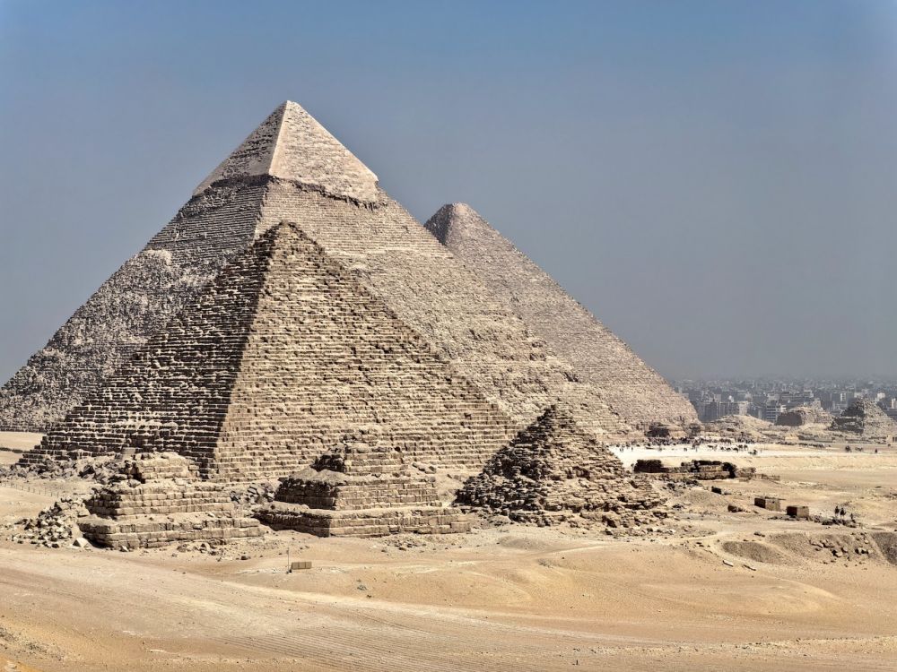 金字塔古埃及文明的象征,是世界最辉煌的古建筑,建于距今约4500年前的埃及古王朝时期。古埃及人建造金字塔,是与他们对来世重生和法老神格化的宗教信仰密切关联。古埃及人相信死亡并非终点,而是一个通往永生的过程。修建宏伟的陵墓可确保灵魂升入天堂并获得永生。金字塔作为法老的陵墓,其形状呈现四面东西南北的方位,三角锥体逐层上升,象征法老灵魂爬升至太阳神的怀抱。古埃及人深信太阳神是创造万物的神祇,金字塔可送法老灵魂升天,与太阳神合而为一,以得到重生。所以金字塔的入口都是面朝太阳升起的方向,迎接法老灵魂回归。目前埃及遗存着100多座金字塔,分布在不同地区。吉萨金字塔群是其中最典型、最辉煌的代表,也是人们参观最多的景点。吉萨金字塔群由胡夫金字塔(Great Pyramid of Khufu)、卡夫拉金字塔(Pyramid of Khafre)和孟卡拉金字塔(Pyramid of Menkaure)三座法老金字塔,以及他们各自妻子的小型金字塔,共9座组成。胡夫是第四王朝第二位法老,卡夫拉和孟卡拉分别是他的儿子和孙子,也是继任者。