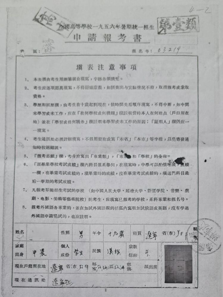 这里展示的是1956年父亲报考大学的原始资料共4页,可以了解父亲的简历,家庭社会关系,高中成绩,报考志愿,高考成绩及录取结果, 有助于了解那个时代高考的基本情况。