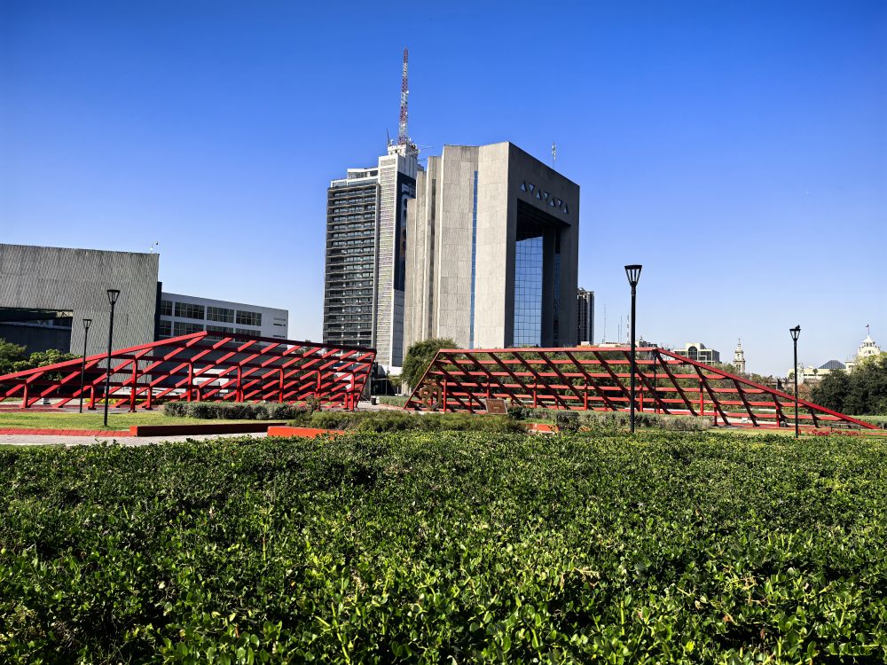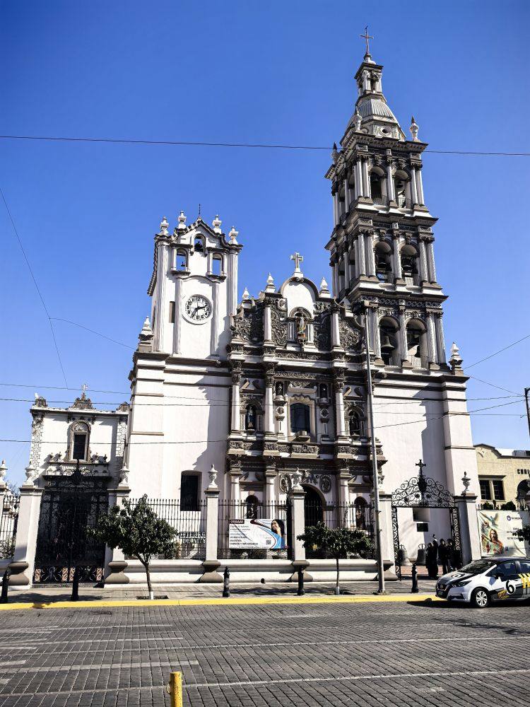 该教堂是蒙特雷的天际线,周边是省政府之类的办公厅,这里是蒙特雷最干净,也是最令人赏心悦目的地方。该教堂最初建于河畔,但17世纪的洪水迫使教堂迁移到了今天的所在地,不过教堂拉丁十字形的中殿正面在1800年才完工,之后教堂成了蒙特雷总教区的主教座堂。尽管很多人说这座教堂是一个建筑杰作,他们惊叹于其复杂的设计、宏伟的祭坛和美丽的彩色玻璃窗,可对于见过各式各样教堂的我来说,它非常普通,我们里里外外逛了一圈便朝蒙特雷广场走去(Macroplaza)。这个广场号称是墨西哥最大的广场,占地40万平方米,比天安门广场小一点儿。广场内有商店、绿地、古老的纪念碑和殖民时期的建筑等,但最引人注目的是70米高的商业灯塔(Faro del Comercio),其顶部的激光束在夜晚会照亮城市夜空。