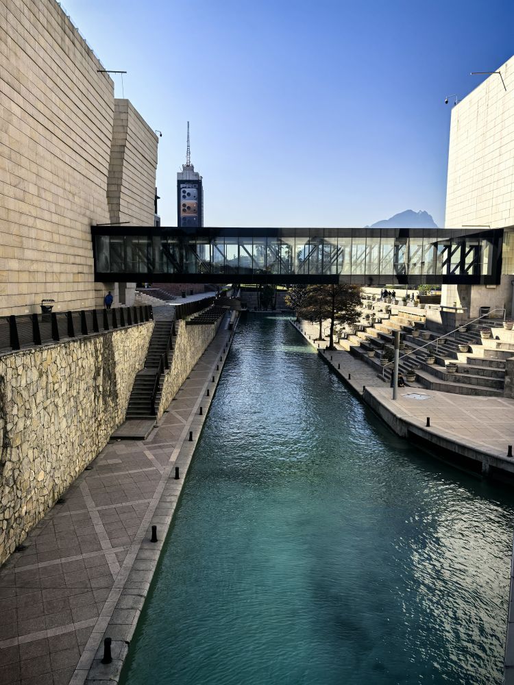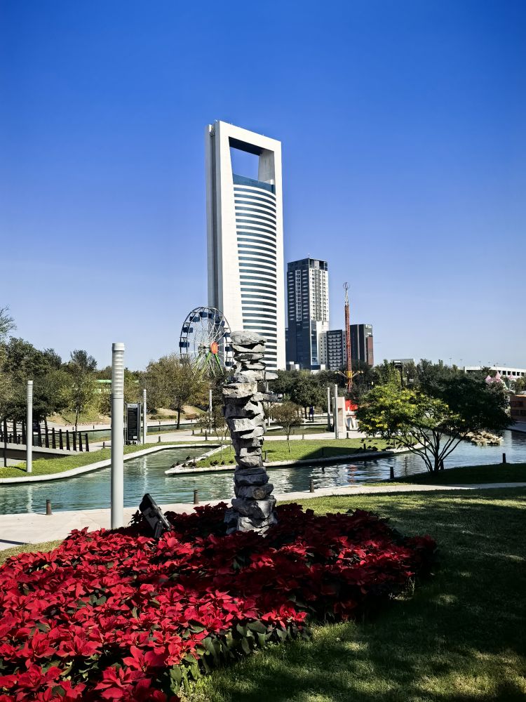 丰迪多拉公园酒店离蒙特雷很有名的丰迪多拉公园(Fundidora Park)不远,我们穿着薄棉袄走了过去。虽然海拔不高的蒙特雷被称为墨西哥最温暖的城市之一,但圣诞节期间的它昼夜温差还是很大,晚上得打暖风睡觉,而白天却可以穿暖袖衬衫,这样的温度让我们不得不夏天和冬天的衣服一起穿。该公园前身是拉丁美洲第一家钢铁铸造厂的蒙特雷铸造厂,自从1986年铸造厂破产后,墨西哥联邦政府和蒙特雷州政府便把这片土地建造成了一座公共公园,并把它命名为“工业考古遗址博物馆”。公园内有一个会议中心、一家酒店和一座电影院,还有游乐园。不过,公园里最迷人的是2个湖泊和一条长2.35公里的人工河和河滨步道及喷泉。人工河里的河水竟然是碧绿色的,美丽至极。
