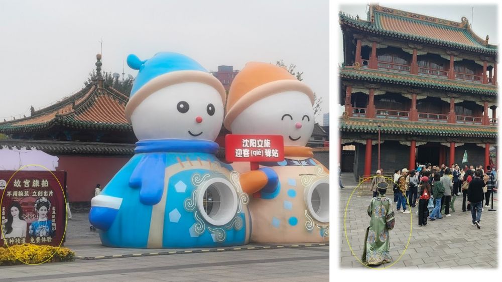 瀋陽市建城甚早,歷經遼、金、元、明、清,五個朝代的增建發展,成為東北地區的政治文化中心。瀋陽故宮是清朝入關前的皇宮,跟著導遊走逛一間間的宮殿樓宇,印象最深的是大正殿以及十王亭所在的廣場。大正殿是皇太極和王公大臣商議國事和舉行典禮的殿堂,十座王亭是左右翼王和八旗辦公的處所,大正殿左後兩排各設五座王亭,中間是廣場,這整個區塊就是滿清入關前的政治中樞了。旅拍生意在中國各地的觀光景點都很盛行,走在這些滿清宮殿建築之間,見到穿著滿清服飾的女人,感覺有趣也比較不違和。
