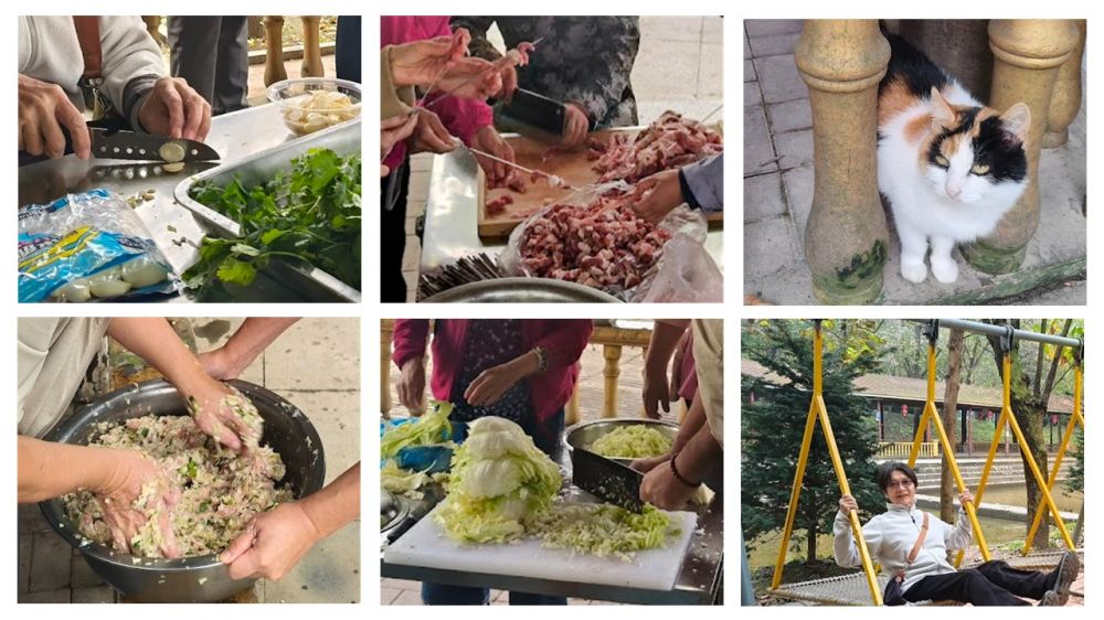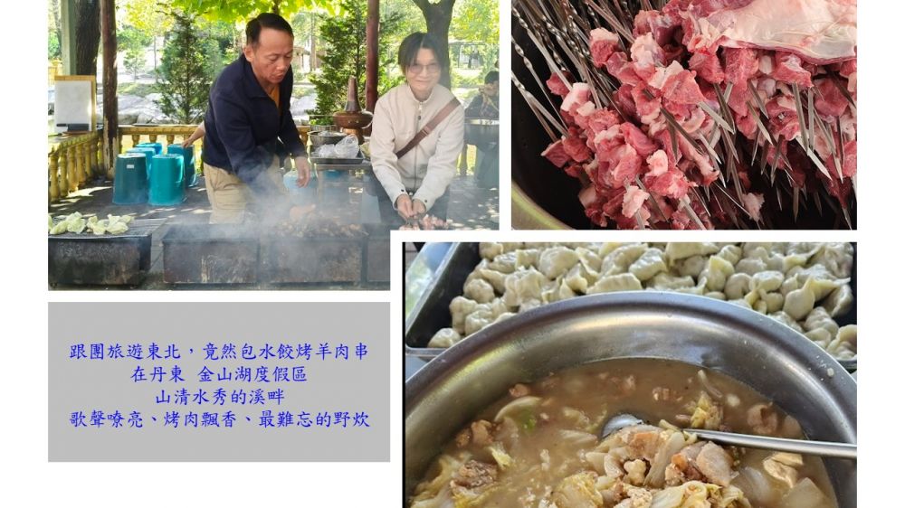 這次是參加朋友自組的東北團,成員有他倆的教友、同學和同事,就像一個親友團;這夥人已跟著小畢導遊玩過內蒙大草原,都是客製化行程。來到丹東的第一個上午,居然在金山湖渡假村安排了一場家族式的包水餃、烤羊肉串的營會活動。在廣場上擺上震撼音響,大夥都動起來,整理場地、洗菜切肉、生火刷鍋、穿肉串、包水餃;火鍋、啤酒、水果、零食,盡情享受豐美午餐。