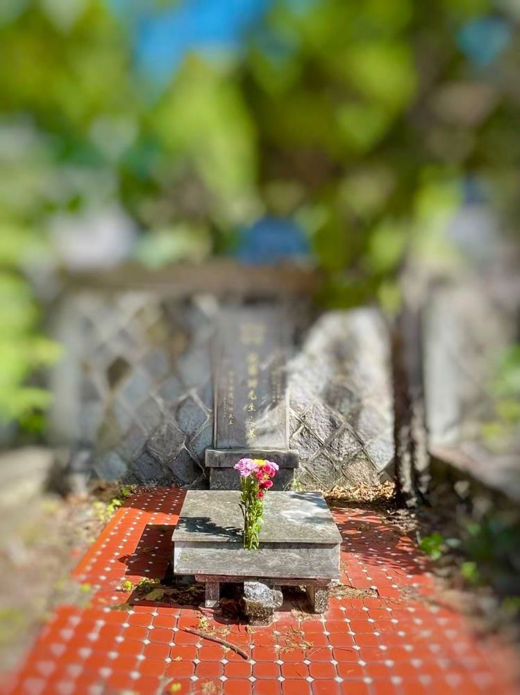 我们一个个台阶拾级而下,生怕错过了外公的墓地,"找到了,终于找到了!"听到妻的叫喊声,我的心一下子提到了嗓子眼。我们循着左手边的一长排甬道往前,终于认出外公的那块长眠之地。这是一块10平米左右的墓地,朴素大气,带着岁月留下的痕迹。墓埕铺着红白相嵌的地砖,一个多甲子过去了,颜色依旧鲜艳如初,地上打扫的也干净,地砖有的地方开裂了,但整体完好无损。墓地中央靠后的位置是墓穴,里面安放着外公的骨灰,墓穴上覆盖着一大一小二块石板拜台,拜台之间有一只小花瓶,供来人凭吊之用——我们把一束鲜花插在里面,灌满清水,以表达敬意和寄托哀思。墓地的尽头竖立一块墓碑,墓碑的后面是护墙,碑文的字体雄健有力,金光灿灿(几年前表弟专门请人涂的金粉),墓碑旁有一棵松树,它象征着不畏严寒,四季常青的君子风范。