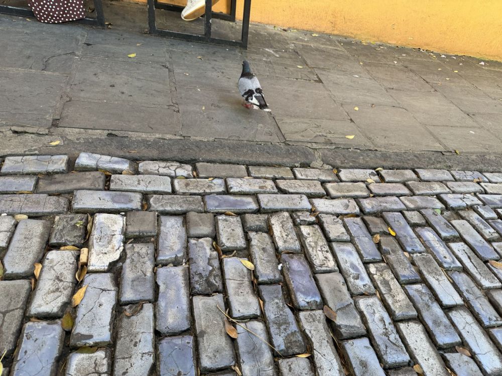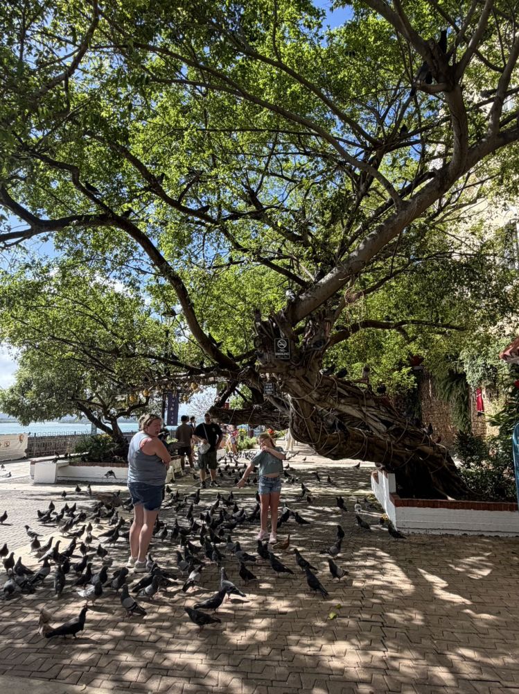 老城区街头巷口有很多鸽子,靠近码头的地方更多。这些鸽子在游客的周围寻食,就像松花江边防洪纪念塔前的那群鸽子一样。鸽子们与图中的两母女嬉戏,把妈妈抓的哇哇大叫,咱根本不敢靠近,早就远远地躲开啦。也是因为这群鸽子,我们没能继续往前蹓跶,回来才发现错过了前面一组代表波多黎各的雕塑,嘿!